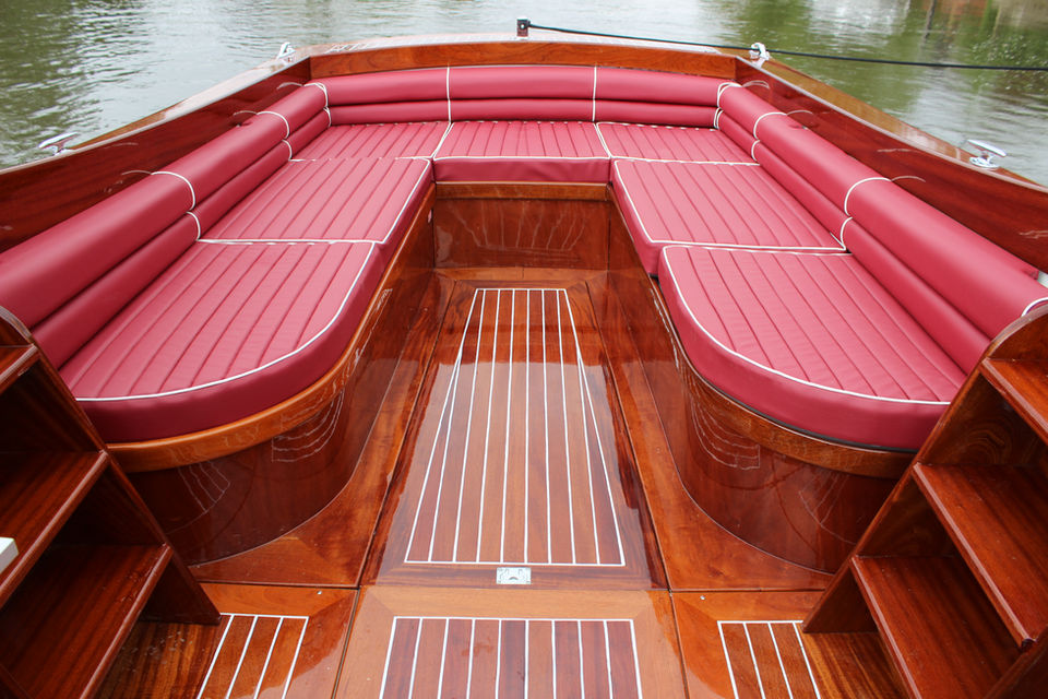 Casino Royale was stripped out completely, in fact, the whole of the hull had to be replaced, as did many ribs. New Iroko boards were cut and bent to form the hull and the design of the interior was developed. The windscreen is a reproduction of a vintage Chris Craft design and is constructed from Mahogany.